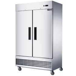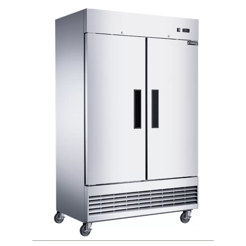 Intérieur et extérieur en acier inoxydable, sol et angles arrondis du meuble pour un nettoyage facile.