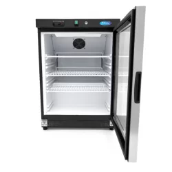 Lorsque l'on travaille avec des ingrédients frais, il est important d'avoir un réfrigérateur qui garde tout au frais le plus longtemps possible. Ce réfrigérateur professionnel noir a une capacité brute de 200 litres et est équipé de trois étagères réglables. Vous pouvez ainsi choisir la meilleure disposition en fonction de vos besoins. Il offre également la possibilité d'augmenter le nombre d'étagères pour créer des compartiments supplémentaires. La porte en verre est munie d'une serrure qui vous permet de voir les produits réfrigérés sans ouvrir le réfrigérateur.