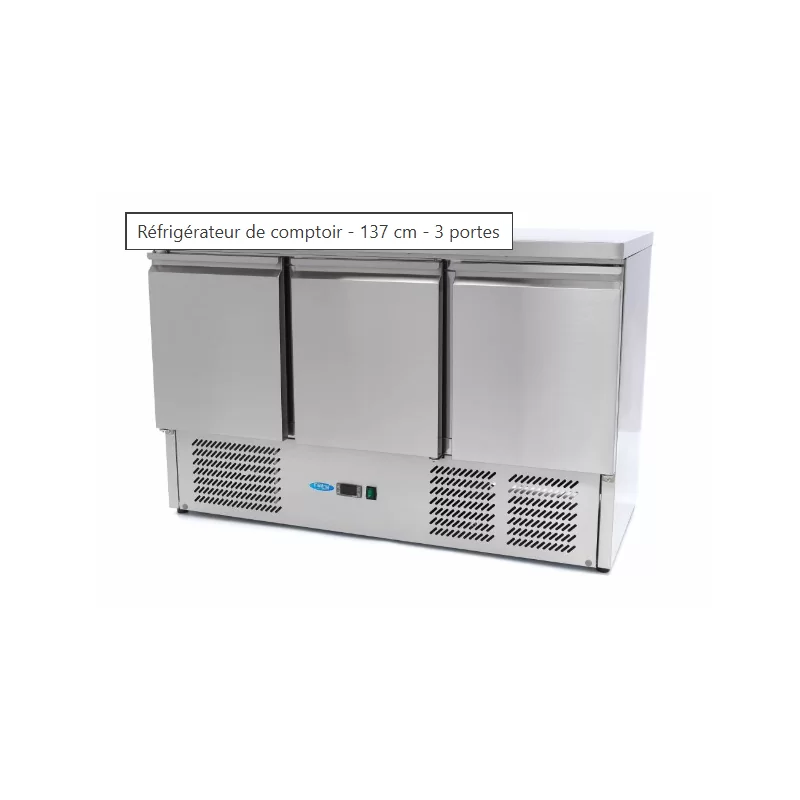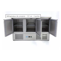 Les appareils de réfrigération de bonne qualité sont indispensables dans une cuisine professionnelle. Tout aliment qui n'est pas en conserve ou emballé reste frais plus longtemps et conserve sa qualité si vous le réfrigérez quelque part, comme dans un bon réfrigérateur de comptoir. L'avantage est que vous disposez d'un bon système de réfrigération et d'un espace de travail fonctionnel avec un plan de travail en acier inoxydable, idéal pour préparer des ingrédients frais. Ce système de réfrigération avec ventilateur a une capacité de 218 litres et derrière chacune des trois portes robustes en acier inoxydable se trouve une étagère réglable qui vous permet de personnaliser votre agencement.