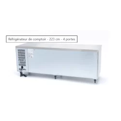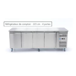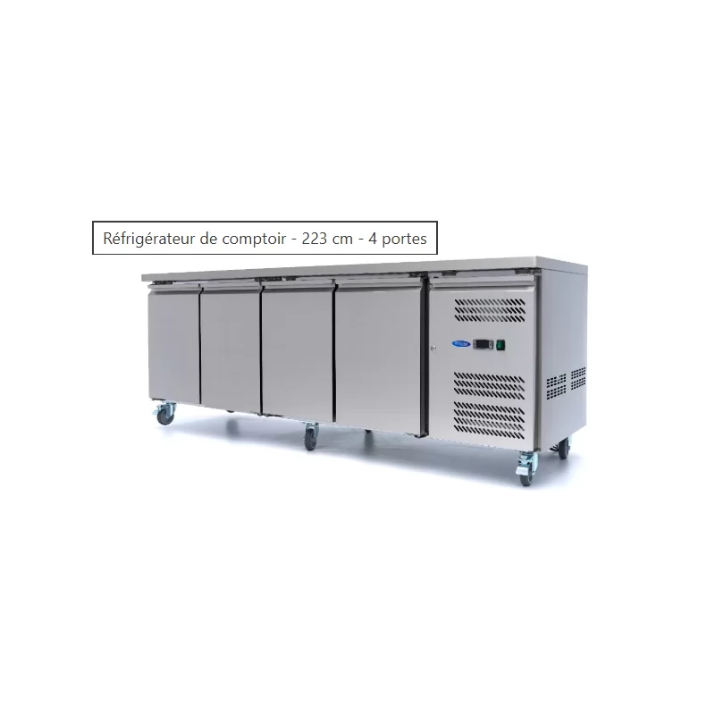 Les caoutchoucs des portes du réfrigérateur de comptoir sont chauffés pour éviter que les portes ne gèlent. Les portes se ferment à l'aide d'un joint magnétique qui empêche de les laisser ouvertes par inadvertance. Avec une longueur de 223 cm, le réfrigérateur de comptoir est très grand mais facile à déplacer grâce aux roues situées en dessous. Les roues avant sont équipées d'un frein, ce qui permet de maintenir le réfrigérateur de comptoir en place. Le plan de travail est idéal pour préparer des repas ou des plats délicieux : tous les ingrédients sont à portée de main.