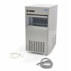 Cette machine à glaçons est bien isolée et hygiénique. Elle a été conçue pour être facile à utiliser. Par l'arrière, la machine est refroidie par air, ce qui signifie qu'elle peut être utilisée dans des pièces qui ne sont pas trop chaudes. Vous recevrez également une pelle pratique pour retirer la glace de la machine à glaçons de manière pratique et hygiénique. De plus, cette machine à glaçons est dotée d'une protection contre les surcharges, ce qui vous permet de travailler en toute sécurité et de ne pas avoir à vous inquiéter d'une surcharge de la machine. Pour congeler l'eau, l'appareil est équipé d'un système de refroidissement efficace et utilise le réfrigérant R290. Vous recevez également des tuyaux d'alimentation pour raccorder la machine à glaçons à une prise d'eau potable. Il n'est pas nécessaire d'ajouter de l'eau manuellement. La machine est entièrement automatique et vous pouvez donc la laisser fonctionner seule. La machine à glaçons n'est pas équipée d'une pompe de vidange. Le tuyau de vidange doit être raccordé plus bas que la sortie de la machine. Sur la face avant de la machine à glaçons se trouve un panneau de commande convivial avec des voyants d'avertissement. En cas de dysfonctionnement, si le bac de stockage est plein ou si le niveau d'eau est trop bas, les voyants lumineux vous alerteront.