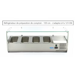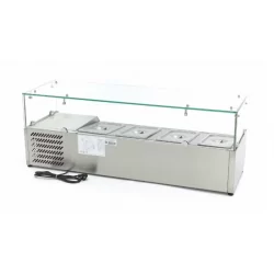 Le réfrigérateur de comptoir est idéal pour une utilisation quotidienne intensive dans toute cuisine professionnelle. Quatre récipients GN 1/3 peuvent y être placés pour aider à conserver les ingrédients à la bonne température et prêts à être utilisés à tout moment. Le réfrigérateur de comptoir est bien adapté aux tâches telles que le remplissage rapide de sandwichs, l'ajout de garnitures sur les pizzas ou la préparation de salades. Les récipients GN et les couvercles ne sont pas inclus, mais peuvent être commandés séparément sur notre site Web.