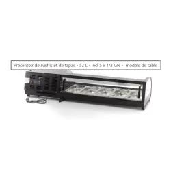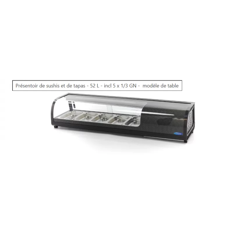 Cette vitrine à tapas convient à la fois pour présenter les aliments et pour garder les petits produits au frais. Le verre bombé et le boîtier noir donnent à cette vitrine un aspect luxueux et élégant. Elle est idéale pour être placée sur un comptoir afin d'être à la vue de vos invités. La vitrine à tapas est adaptée à la présentation de tapas, mais aussi à la conservation au frais de plats de sushis et de produits à base de poisson. Cette vitrine à tapas professionnelle peut être utilisée en combinaison avec des conteneurs GN. Ce présentoir à sushis est fourni en standard avec 5 plateaux GN de 1/3.