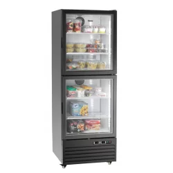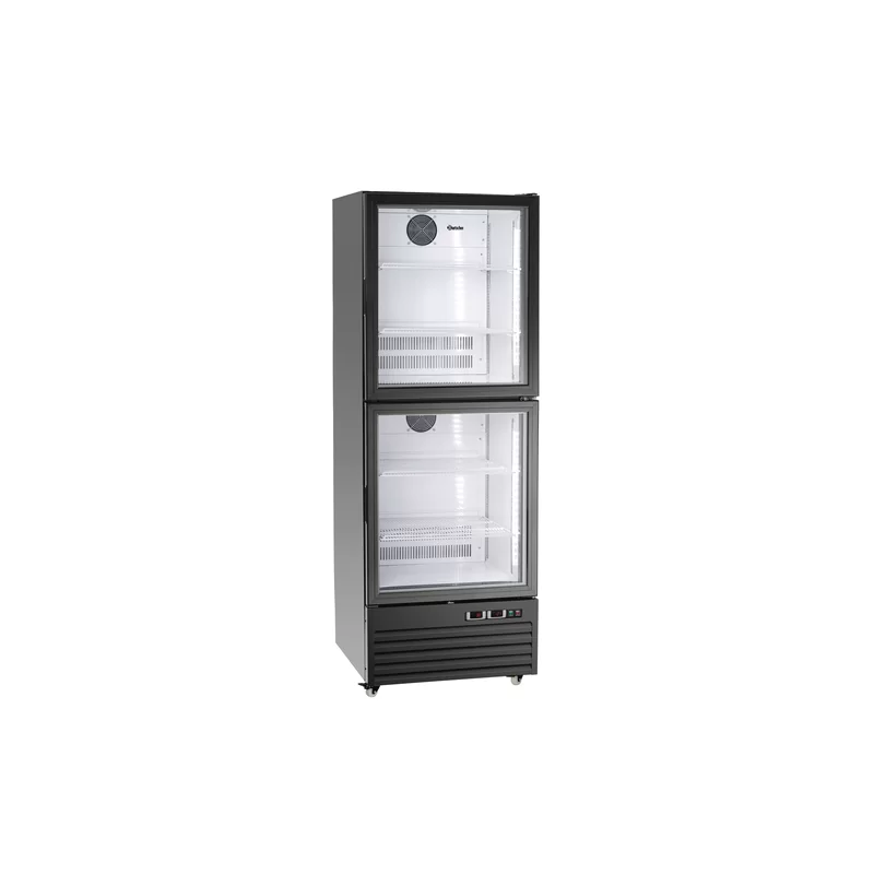 Réfrigérateur et congélateur combiné dans un design noir esthétique avec une contenance de 430 litres. Les portes en verre permettent de voir directement les aliments qui sont mis en valeur par l'éclairage LED commutable séparément.