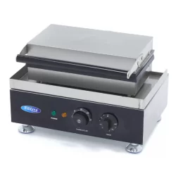 Avec ce gaufrier, vous pouvez rapidement et facilement créer six corn dogs nervurés en même temps. Le gaufrier est équipé d'une plaque de cuisson en aluminium avec revêtement antiadhésif. La plaque de cuisson présente un motif en losange et des encoches pour les bâtonnets. Le gaufrier est facile à utiliser et parfait pour une utilisation quotidienne.