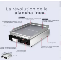 La plancha électrique profondeur Confort offre une puissance de 2 x 2 700 W (soit 5400 W) pour une surface de cuisson de 44,2 x 64,2 cm. Cet appareil vous surprendra par ses performances : une montée en température rapide (8 min pour 250 °C) et une excellente répartition de la chaleur.