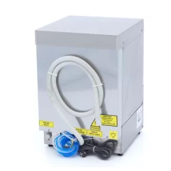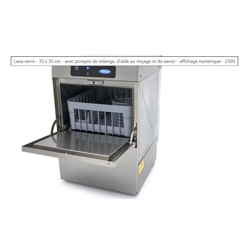 This glass washer is highly economical, consuming only 2,5L of water per cycle. It offers safety features, such as thermal protection and IPX5 protection for the control panel. It's also easy to operate the machine with a single button for water filling and heating in the boiler tank. The digital pressure switch for the washing tank allows easy adjustment of the water level, while the NTC sensor controls the thermostat. The glasses are washed at 55-60°C and rinsed at 80-85°C, resulting in faster drying. You can choose to preheat the water or start with cold washing. Four indicator lights show the status of filling, heating, washing and programme durations. The glass washer makes a sound once the cycle is finished. It comes with a 35 x 35cm glass basket, a plate rack insert, a cutlery basket, and a supply and drain hose for connecting to the water supply. The dishwasher includes rinse aid, soap and drain pumps. Four adjustable feet allow for easy height customisation.