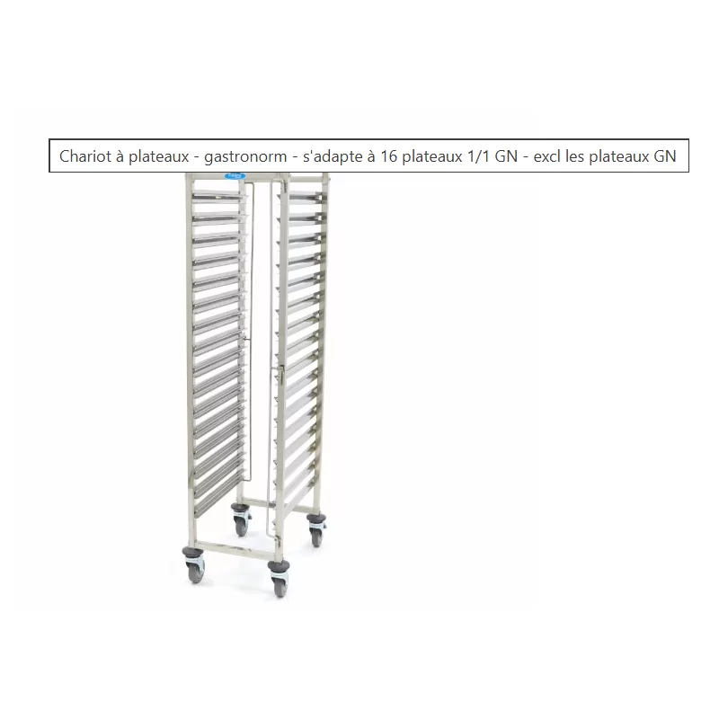 L'utilisation d'un chariot à plateaux vous permet de transporter plusieurs objets en une seule fois, ce qui vous évite, ainsi qu'à votre personnel, de soulever et de marcher. Ce chariot dispose d'un support suffisant pour accueillir 16 étagères de plateaux GN 1/1. Les étagères ont des bords repliés et les coins ont été soudés et polis pour empêcher la saleté de s'accumuler. Vous pouvez travailler en toute sécurité avec ce chariot, grâce à sa finition soignée sans arêtes vives. Les pieds du chariot sont très robustes. Le chariot à plateaux est livré à plat et peut être assemblé en 10 minutes. Les plateaux ou les étagères ne sont pas inclus mais peuvent être commandés dans notre boutique en ligne.