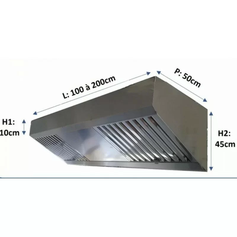 Dimension : Longueur 1000 à 2000 mm X Htr 400mm X largeur (avancée) 500mm. Filtres choc à chicanes de 500*400H. (hotte de 1m : 2*1/2 - hotte de 1.5 à 2m : 2 )